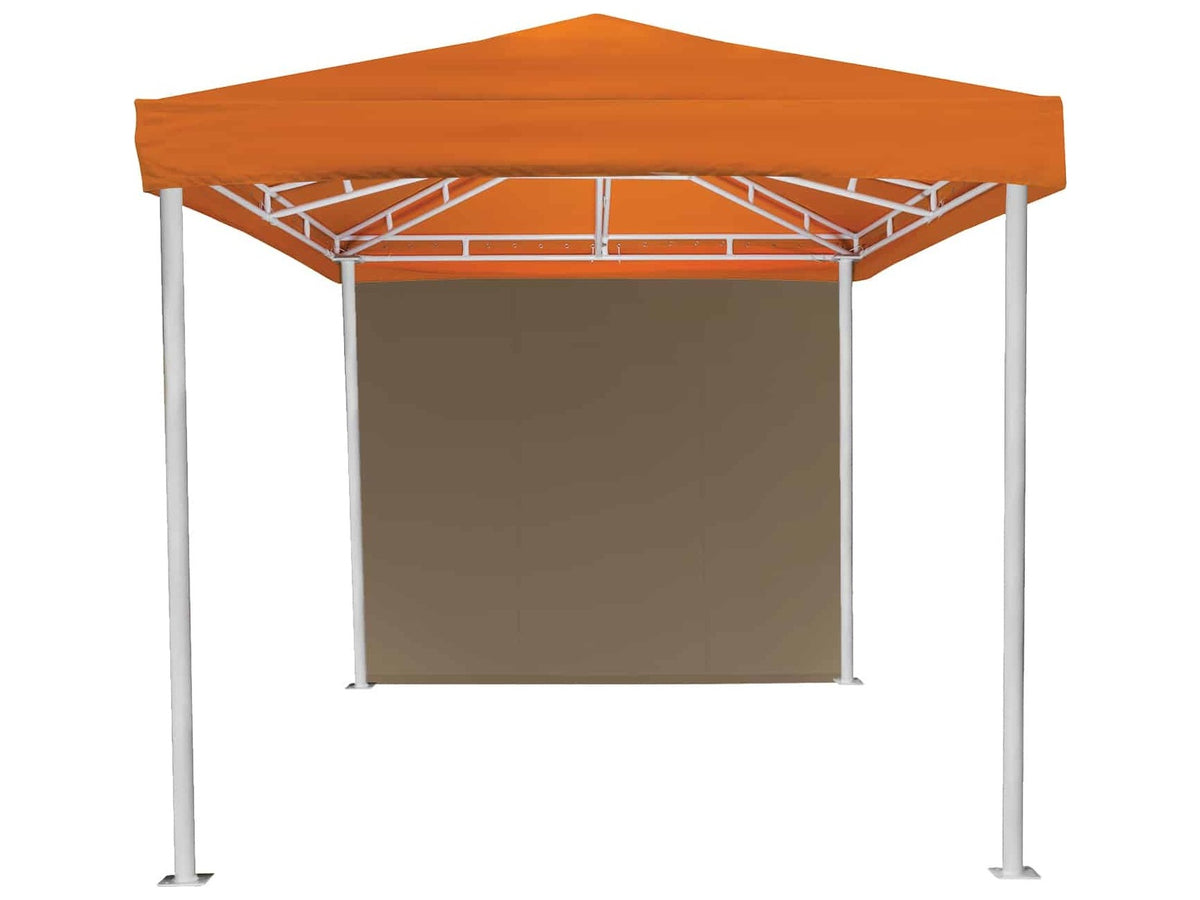 The Oasis Cabana is shown here with a vented roof, fThe corner decorative curtains.